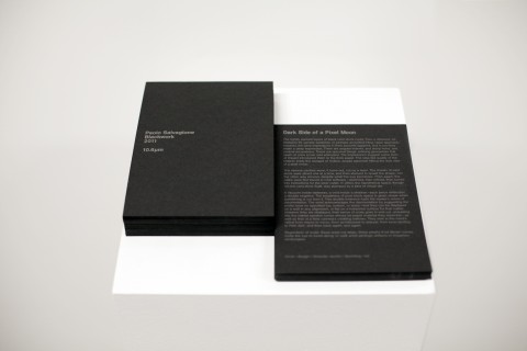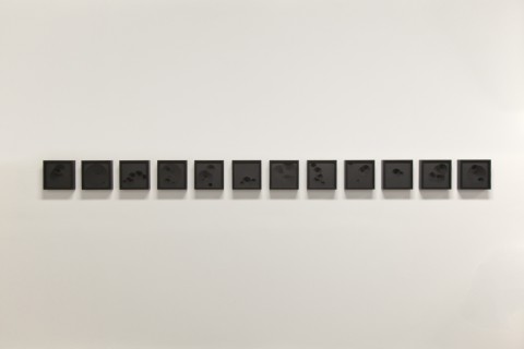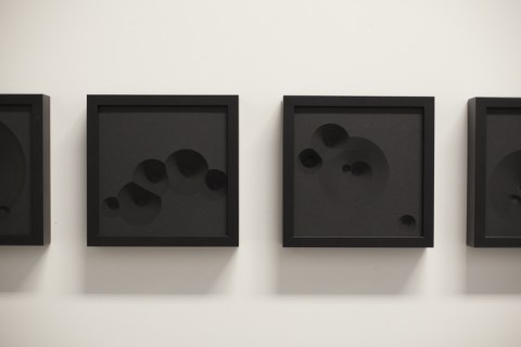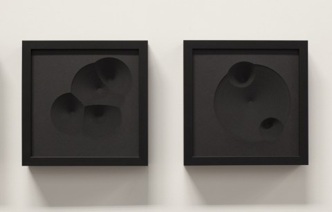 The tightly packed layers of black card stock could, from a distance, be mistaken for sample swatches, or perhaps acoustical tiling. Upon approach, however, the deep impressions in them become apparent, and in turn they make a deep impression. There are angular indents, and sharp holes, and conical excavations. These are quizzical things, enticing geometries that seem at once iconic and whimsical. The impressions suggest some form of impact introduced them to the thick paper. The step-like quality of the indents imply the ravages of motion, arcade asteroids hitting the dark side of a pixel moon.